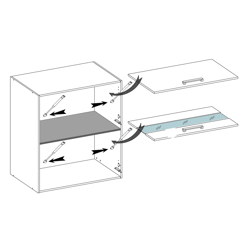 - tiché otevírání vrchních výklopných skříněk díky plynovým pístům