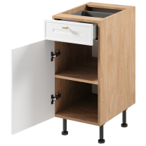 Dolní skříňka Sorento D40S1 disponuje 1 šuplíkem a 1 policí. Dvířka jsou univerzální, lze je namontovat na obě strany.