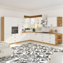 - elegantní vzhled: Hladká bílé dvířka v matném provedení, doplněná o černé kovové úchytky, dodávají kuchyni moderní nádech.