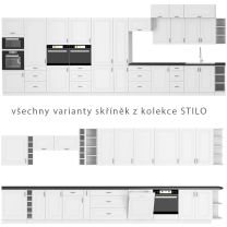 Kuchyňská linka STILO nabízí již předdefinované sestavy i širokou škálu jednotlivých skříněk, ze kterých si snadno naplánujete kuchyni podle svých představ a potřeb. Stilo nabízíme ve velice moderním a žádaném odstínu matné bílé. Dvířka zdobí prolisy a kovové úchyty v černé barvě.