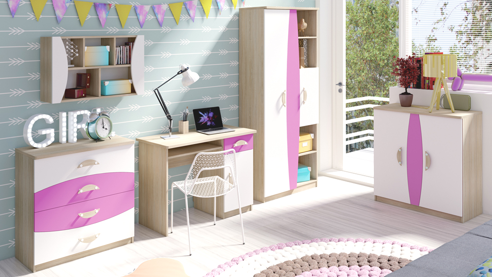 Komoda K4SZ - Dětský pokoj Tenus II prosvětlí a osvěží pokojíčky Vašich dětí. Nábytek je vhodný do menších i větších pokojů. Kolekci nabízíme v atraktivních kombinacích dub sonoma/bílá/růžová nebo dub sonoma/bílá/tyrkys. Nábytek je vyroben z kvalitní laminátové dřevotřísky. Zboží Vám doručíme v demontu s návodem na sestavení a kováním.