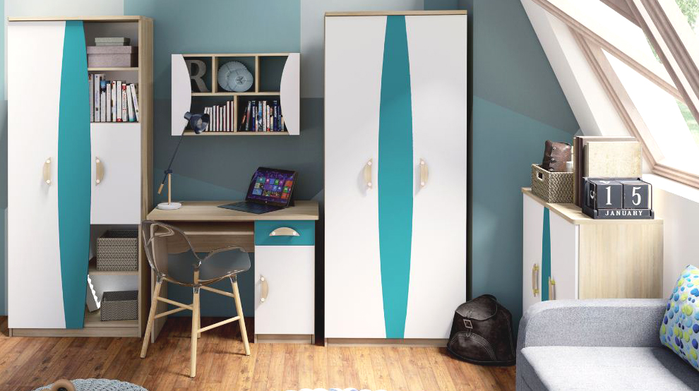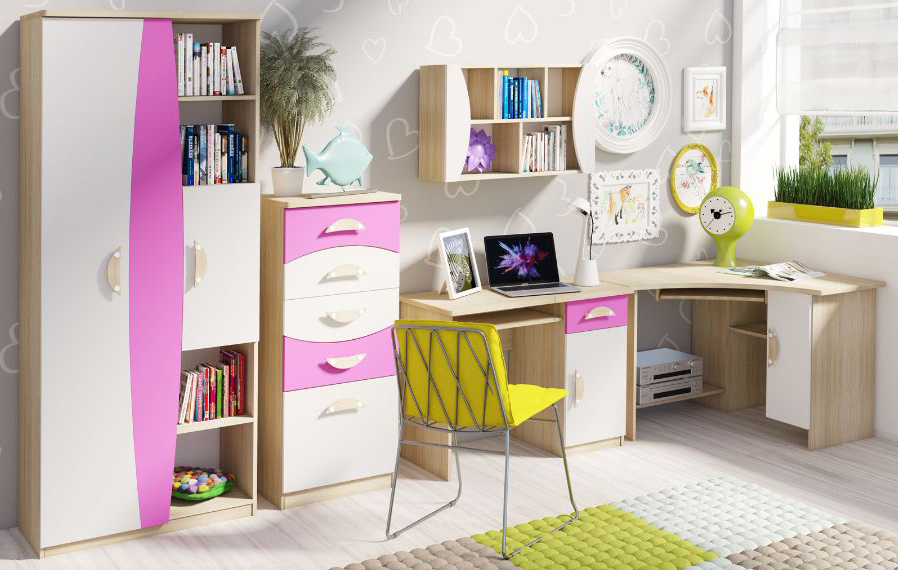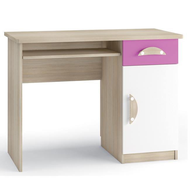 Psací stůl - Dětský pokoj Tenus II prosvětlí a osvěží pokojíčky Vašich dětí. Nábytek je vhodný do menších i větších pokojů. Kolekci nabízíme v atraktivních kombinacích dub sonoma/bílá/růžová nebo dub sonoma/bílá/tyrkys. Nábytek je vyroben z kvalitní laminátové dřevotřísky. Zboží Vám doručíme v demontu s návodem na sestavení a kováním.