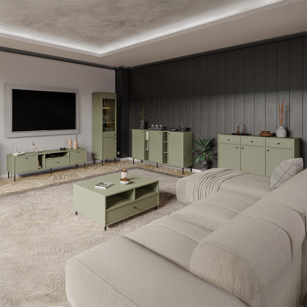 - Vnitřek skříní je v jednotné eukalyptové barvě, díky čemuž působí nábytek dokonale sladěně i při otevření.