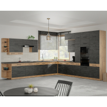 Kuchyňská linka VIGO nabízí již předdefinované sestavy i širokou škálu jednotlivých skříněk, ze kterých si snadno naplánujete kuchyni podle svých představ a potřeb. Stilo nabízíme v moderní tmavé kombinaci dubu lancelot a dark wood. Dvířka a zásuvky zdobí kovové úchyty v černé barvě.